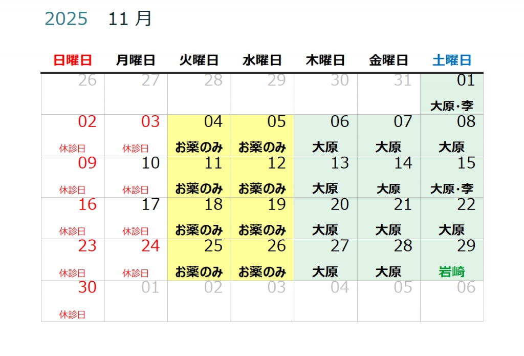 10月の診察日は10/11・10/25、11月の診察日は11/8・11/22です。