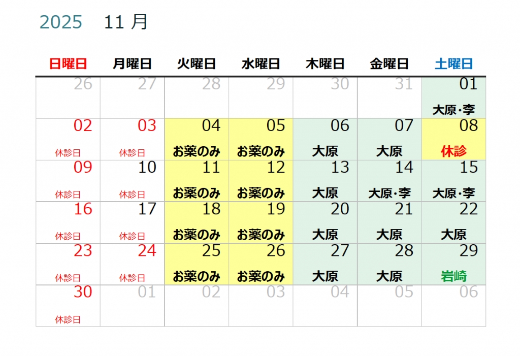 11月の診察日は11/8・11/22、12月の診察日は12/13・12/27です。