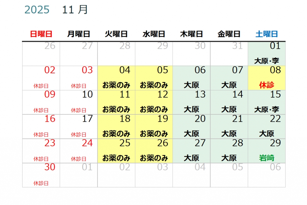 11月の診察日は11/8・11/2212月の診察日は12/13・12/27です。
